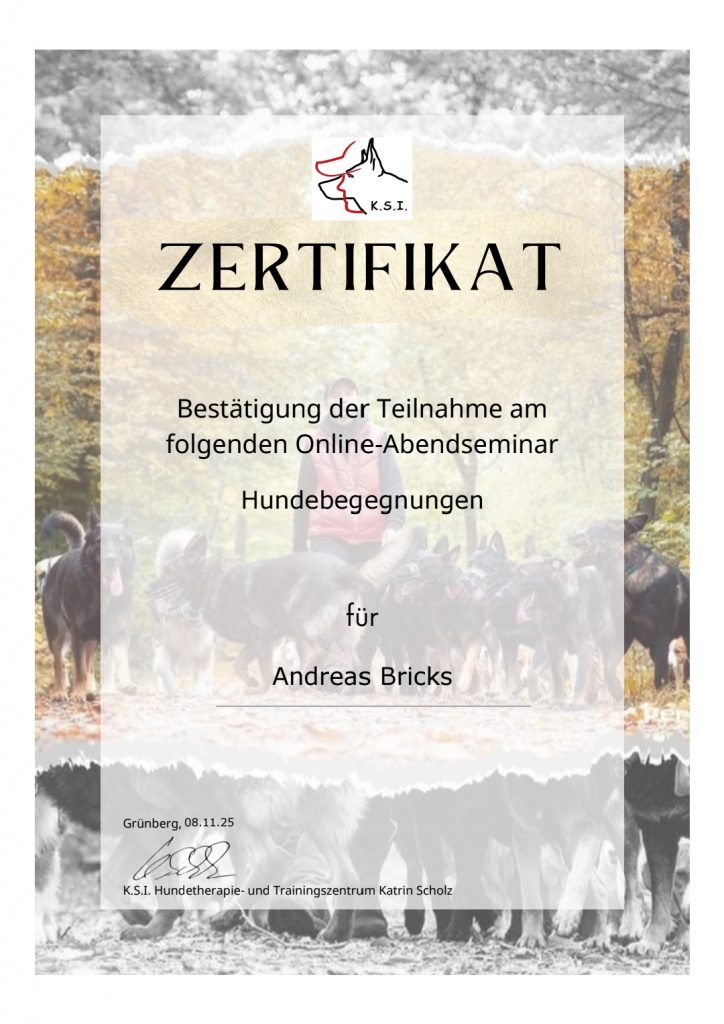 | Hundebegegnungen | K.S.I. Hundezentrum Katrin Scholz 08.11.2025 Webinar | In diesem Seminar sollt ihr Lösungsvorschläge bekommen, die euch in Hundebegegnungen weiter bringen sollen. Natürlich gibt es nicht DIE Lösung, aber viele Ideen und Ansätze, die helfen könnten. Wie gehe ich mit meinem Hund um, wenn ein unkontrollierter Hund auf mich zukommt? Wie gehe ich mit Menschen um, denen es völlig egal ist, dass mein Hund angeleint ist. Wie kann ich handeln, um nicht das Gesicht meinem Hund gegenüber zu verlieren? Wie kann ich Gefahrenprävention betreiben? Nach dem Seminar solltet ihr vieles klarer sehen, dennoch gibt es nicht DAS all Heilmittel. Wir werden uns aber bemühen, euch gerade im Umgang mit uneinsichtigen Menschen weiter zu helfen. |