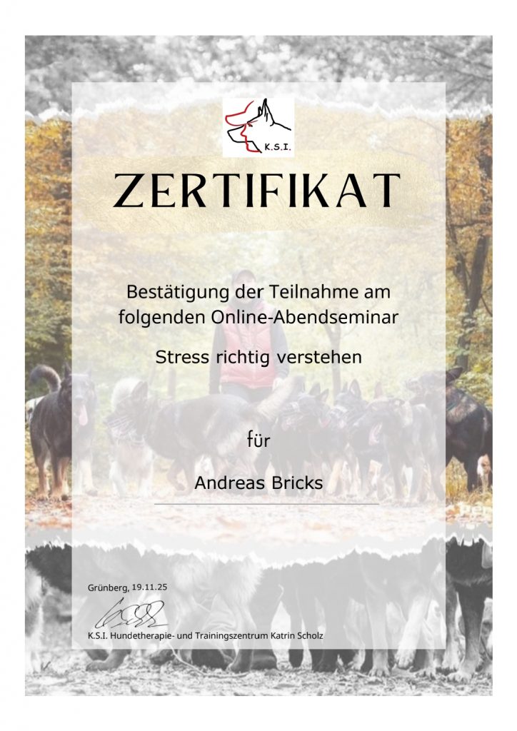 | Stress richtig verstehen, Stress erkennen. Deinem Hund helfen | K.S.I. Hundezentrum Katrin Scholz 19.11.2025 Webinar | Seminarinhalte: Stresssymptome erkennen – von subtilen Signalen bis zu deutlichen Veränderungen im Verhalten. Gesunden von ungesundem Stress unterscheiden – wann ist er normal und wann problematisch? Typische Fehler vermeiden – damit du Stress nicht unbeabsichtigt verstärkst. Strategien entwickeln – praktische Methoden, um deinem Hund zu helfen. Stressresistenz aufbauen – deinen Hund nachhaltig stärken und fördern. |