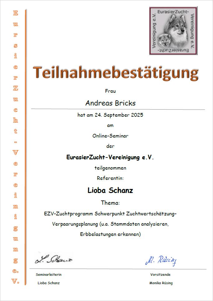 | Zuchtwertschätzung – Verpaarungsplanung | Lioba Schanz, Eurasier Zuchtvereinigung – 24.09.2025 Webinar | Stammdaten analysieren und Erbbelastungen erkennen |